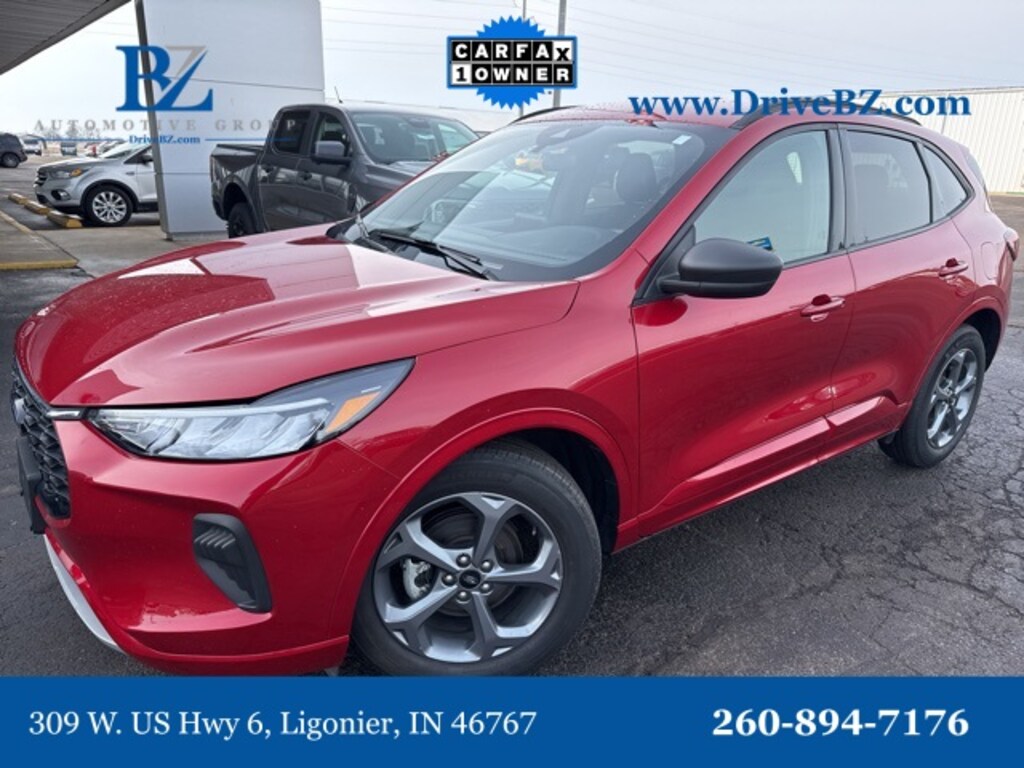 Certified. 2.5L iVCT, 2.91 Axle Ratio, Electronic Fuel Door Release, Equipment Group 301A, Neutral Towing Capability, Pedestrian Alert Sounder. BZ Auto Group applies a Doc Fee of $251.05, plus Indiana Sales Tax and Title Fees, to the final purchase price of every vehicle sale. CARFAX One-Owner. Rapid Red Metallic Tinted Clearcoat 2023 Ford Escape Hybrid ST-Line FWD eCVT 2.5L iVCT