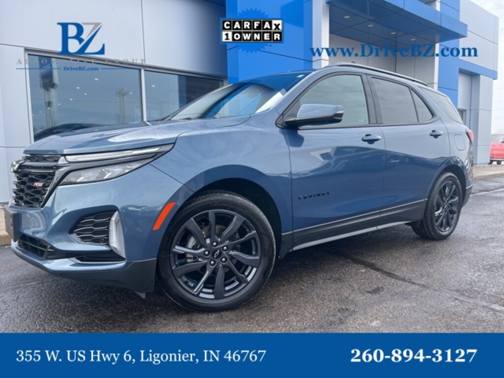 Recent Arrival! AWD, 120-Volt Power Outlet, 2 Rear USB Charging-Only Ports, 2 USB Data Ports, 2 USB Data Ports w/SD Card Reader, Adaptive Cruise Control, Advanced Safety Package, Bluetooth® For Phone, Bose Premium 7-Speaker Audio System Feature, Driver Seatback Map Pocket, HD Surround Vision, Heated Steering Wheel, Infotainment Package, Outside Heated Power-Adjustable Mirrors, Perforated Leather-Appointed Seat Trim, Preferred Equipment Group 1RS, Radio: Chevrolet Infotainment 3 Plus System, RS Leather Package, Safety & Infotainment Package, SiriusXM. BZ Auto Group applies a Doc Fee of $251.05, plus Indiana Sales Tax and Title Fees, to the final purchase price of every vehicle sale. CARFAX One-Owner. Clean CARFAX. Lakeshore Blue Metallic 2024 Chevrolet Equinox RS AWD 6-Speed Automatic Electronic with Overdrive 1.5L DOHC